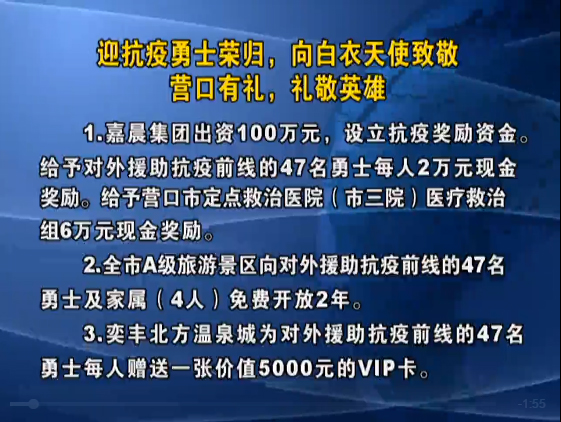 众博线上登陆以体现大企业的责任与担当,出资100万元,设立抗疫奖励资金。给予对外援助抗疫前线的47名勇士每人2万元现金奖励;给予营口市定点救治医院(市三院)医疗救治组6万元现金奖励。以此表达对抗疫英雄的崇高敬意和无限爱戴。