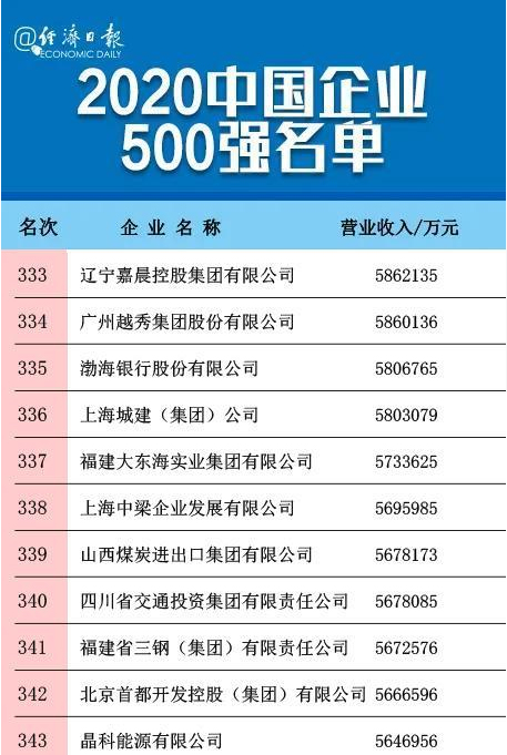 2020年9月28日,中国500强企业高峰论坛全体大会在郑州召开,会上发布了“2020中国企业500强”。榜单显示,辽宁嘉晨控股集团有限公司榜单排名第333位。